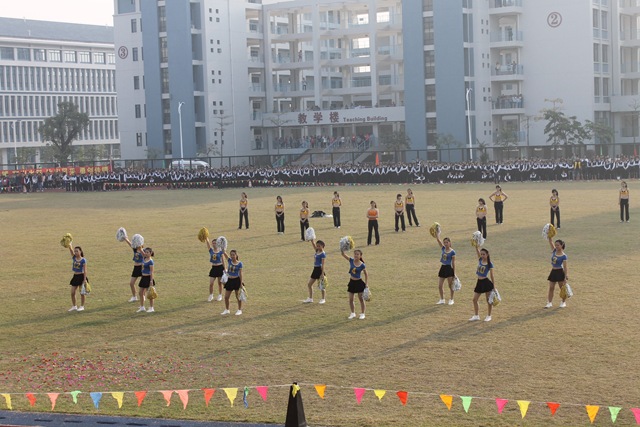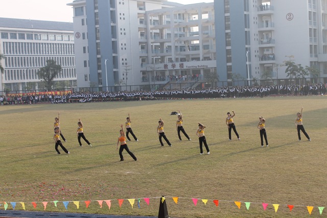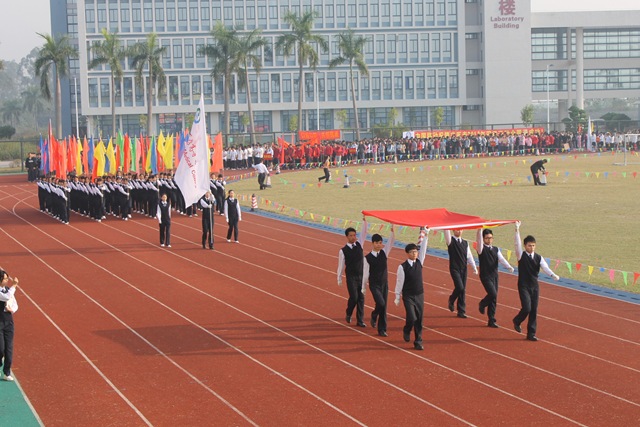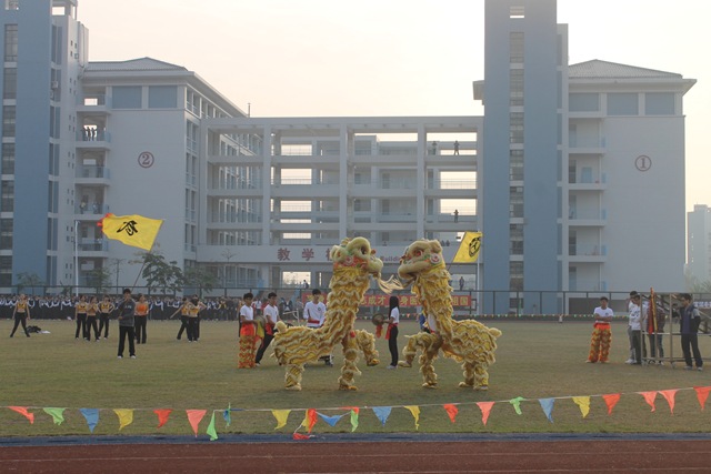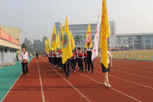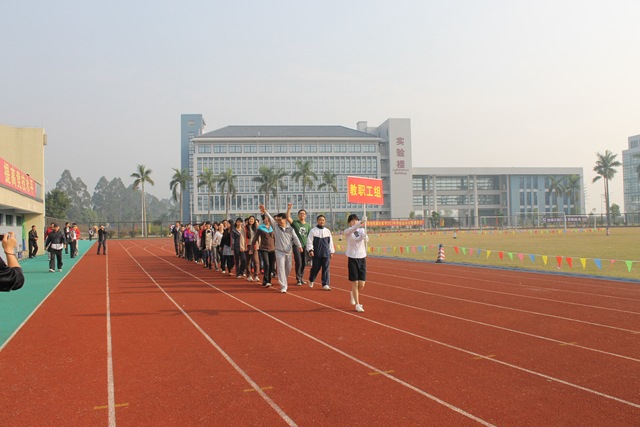 伴随着激昂的运动员进行曲,开幕式开始。醒狮表演、武术表演、啦啦操表演、师生健美操表演,充分地显示了同学们的青春活力和朝气蓬勃的精神面貌。国旗护卫队擎着五星红旗,迈着铿锵有力的步伐走过主席台,拉开了运动员入场的序幕。运动员代表队、教工代表队及各班级代表队,跨着整齐的步伐、朝气蓬勃地从主席台走过,昂扬的士气充分展现出我校师生锐意进取、团结向上的精神风貌。入场仪式之后,田径运动比赛正式开始,此次运动会比赛项目有100米、800米、4×100米、铅球、跳高、跳远等比赛项目。赛场上运动健儿们顽强拼搏,奋力争先,赛出了风格,赛出了水平,取得了优异成绩。本次运动会设立了教职工比赛项目,学校行政人员、各系部老师、教职工踊跃参赛,师生同乐。观众席上彩旗挥舞,各班啦啦队们为运动员呐喊助威,气氛十分热烈!