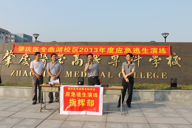 9月17日下午,肇庆医专鼎湖校区开展师生消防演练,学校副校长张明、后勤处处长刑子伟、鼎湖综合办全体人员及辅导员等到现场指挥消防逃生演练。