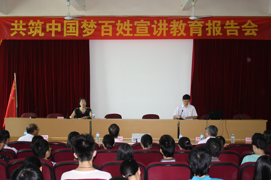 6月28日下午,肇庆市委宣讲团莅临我校,为我校师生员工作“共筑中国梦”百姓宣讲讲座。学校党委书记孔德扬、党委副书记陈彤、学校领导班子成员、中层干部以及师生党员代表参加了本次宣讲活动。宣讲团成员韩月香同志、侯爱玲同志、贾东亮同志从“中国梦”的提出背景、基本内涵和实现途径等方面,结合自己的学习体会和工作实践,用简练的语言、翔实的数据、生动的事例对“中国梦”进行了阐述。报告紧扣“中国梦”主题,坚持理论与实际相结合,既有理论深度,又有很强的现实针对性,对于我们全面准确地理解党的十八大及“中国梦”精神实质,特别是深刻领会习近平主席的讲话精神,具有非常重要的指导意义。深入学习领会“中国梦”精神实质,构筑“医专梦”、“我的梦”是当前和今后一段时期我校的一项重要工作,全校各党支部和各处室、系部等部门要作为一项政治任务来抓紧、抓好、抓实。报告让大家进一步开阔了眼界、武装了头脑、启发了思路、增强了信心,对我们进一步理清加快学校的建设和发展的思路有极大的启迪作用。