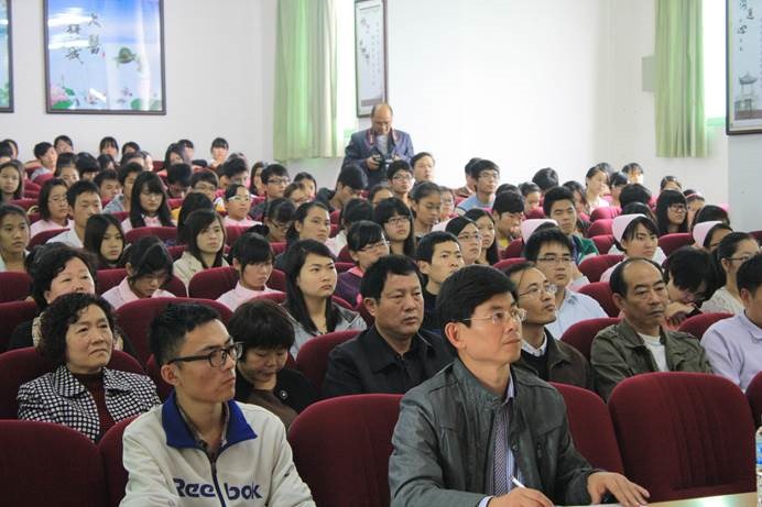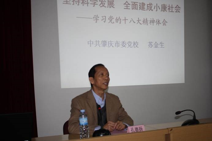 为深入学习贯彻党的十八大精神,切实把我校师生的思想和行动统一到党的十八大精神上来,根据肇庆市委的统一部署,12月14日,我校迎来了肇庆市委学习贯彻党的十八大精神宣讲团成员、中共肇庆市委党校常务副校长、肇庆市党校学术研究会会长苏金生教授为我校师生作学习贯彻党的十八大精神报告。本次报告会由学校党委书记孔德扬主持,参加报告会的有:肇庆市委宣传部讲师团教务办主任莫学松、学校党委副书记陈彤、各党支部书记、副书记以及师生党员代表。
