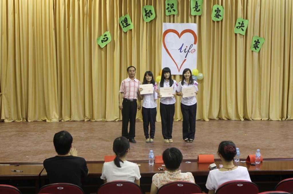综合办刘其礼主任为获得一等奖的选手:药学3班的黄洁蓉、徐诗颖、李泳婷颁奖