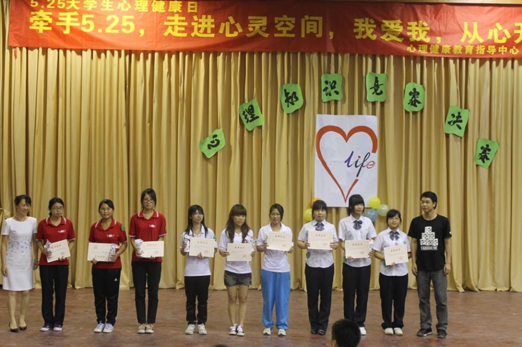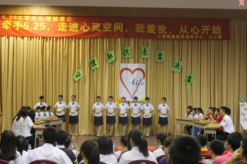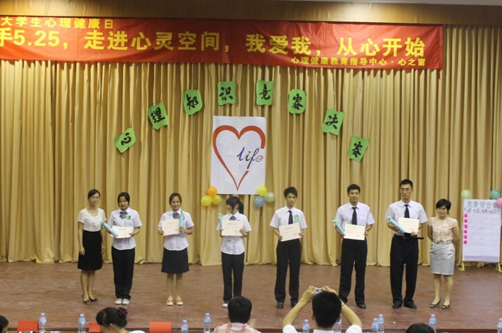 5.25谐音我爱我,为全国大学生心理健康日。为了更好地向同学们宣传5.25这个特殊且重要的日子,由心之窗主办,广播站协办的以“心理知识,我们一起来约会吧”为主题的第八届心理知识竞赛决赛于5月27日晚上7时在鼎湖校区的学术厅举行。本次比赛特邀了鼎湖校区综合办刘其礼主任、心理咨询室李敏老师、肇庆理工学校的刘俊芳老师、陈虹老师、冯伟健老师参加了本次活动。
