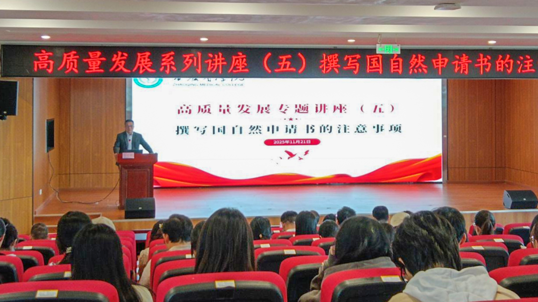 2025年11月21日,肇庆医学院在新区校区行政楼二楼初心堂举办高质量发展系列讲座(五)——国家自然科学基金申报辅导讲座。本次讲座特邀南方医科大学庞建新教授担任主讲,南方医科大学帮扶队队长徐江平教授主持活动。学校科研骨干、青年教师及学生代表百余人参加。