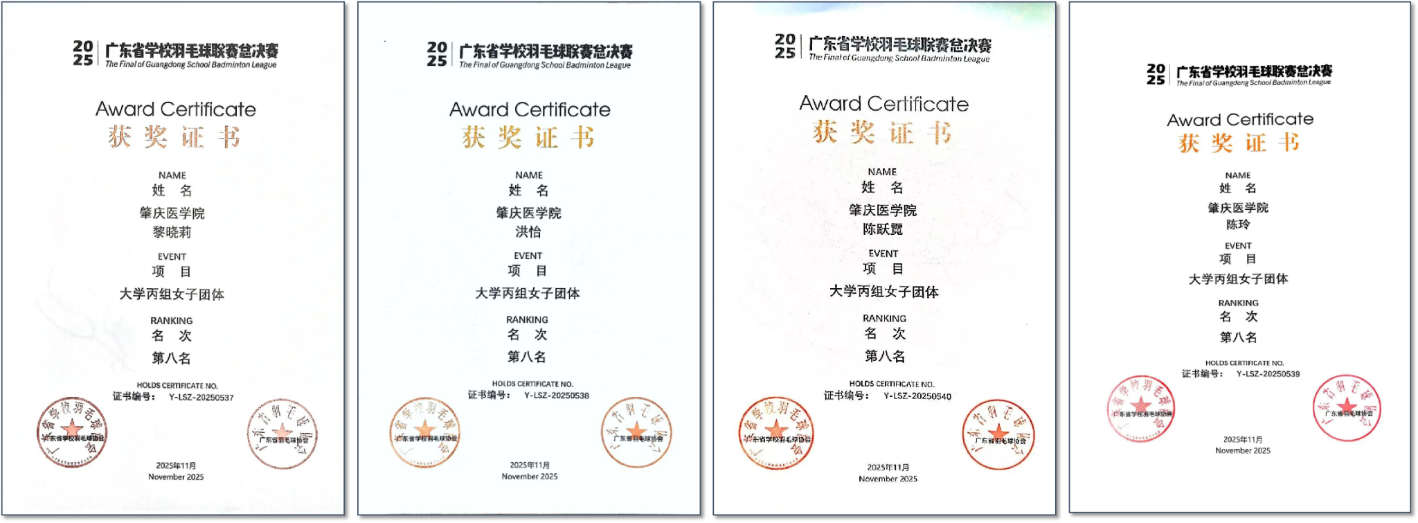 在2025年11月19日圆满落幕的广东省学校羽毛球联赛总决赛中,我校羽毛球队奋勇拼搏,斩获大学丙组女子团体第八名,创造了我校在该项赛事中的历史最佳战绩。