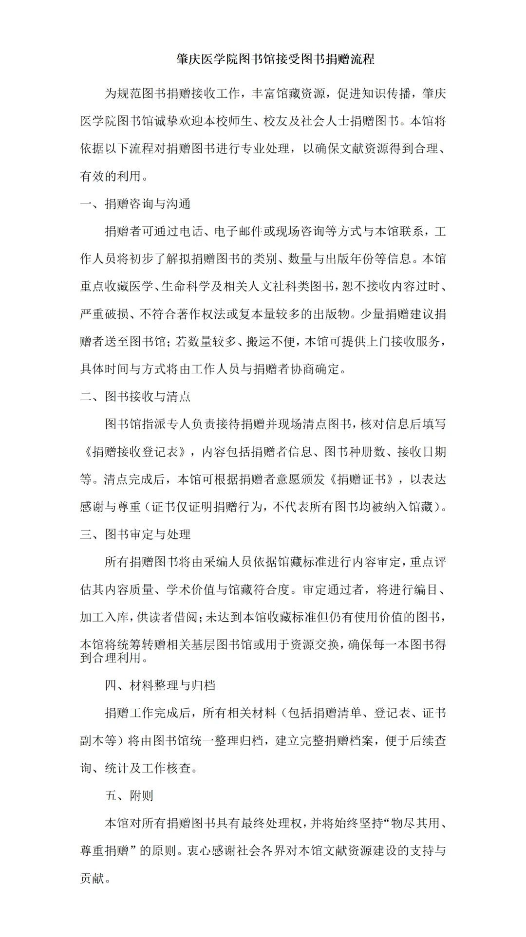 以上是肇庆医学院图书馆接受图书捐赠流程,供有意愿捐书的校友参考,咨询电话:0758-2857581(叶老师)。