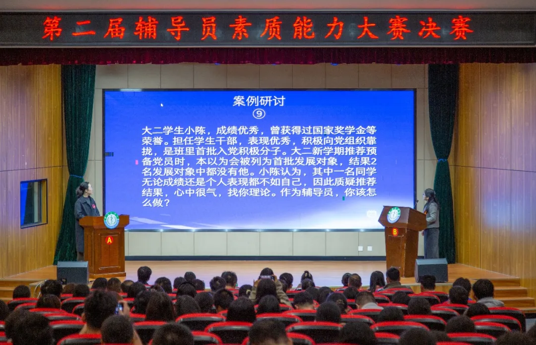 12月29日,学校第二届辅导员素质能力大赛决赛火热上演!8位从各学院脱颖而出的辅导员老师,在图书馆学术报告厅展开了一场别开生面的“能力对决”。学校党委副书记邹云容、相关职能部门负责人、各学院老师及学生代表共200余人一起围观了这场精彩赛事。