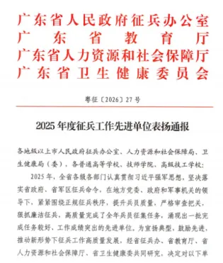 近日,广东省人民政府征兵办公室、广东省教育厅、广东省人力资源和社会保障厅、广东省卫生健康委员会联合发布表扬通报,我校获评广东省“2025年度征兵工作先进单位”。这一荣誉,是对我校长期深耕国防教育、扎实推进征兵工作的高度肯定,更是对肇医学子携笔从戎、报效家国精神风貌的有力褒奖。