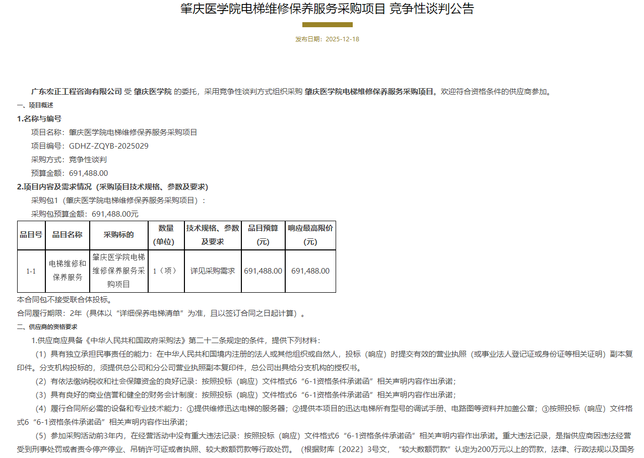 肇庆医学院电梯维修保养服务采购项目竞争性谈判公告
