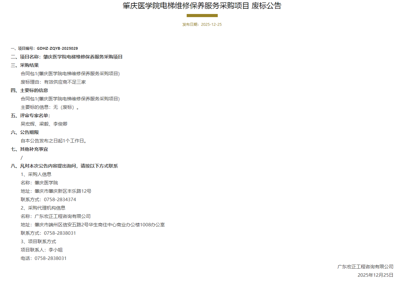 肇庆医学院电梯维修保养服务采购项目 废标公告