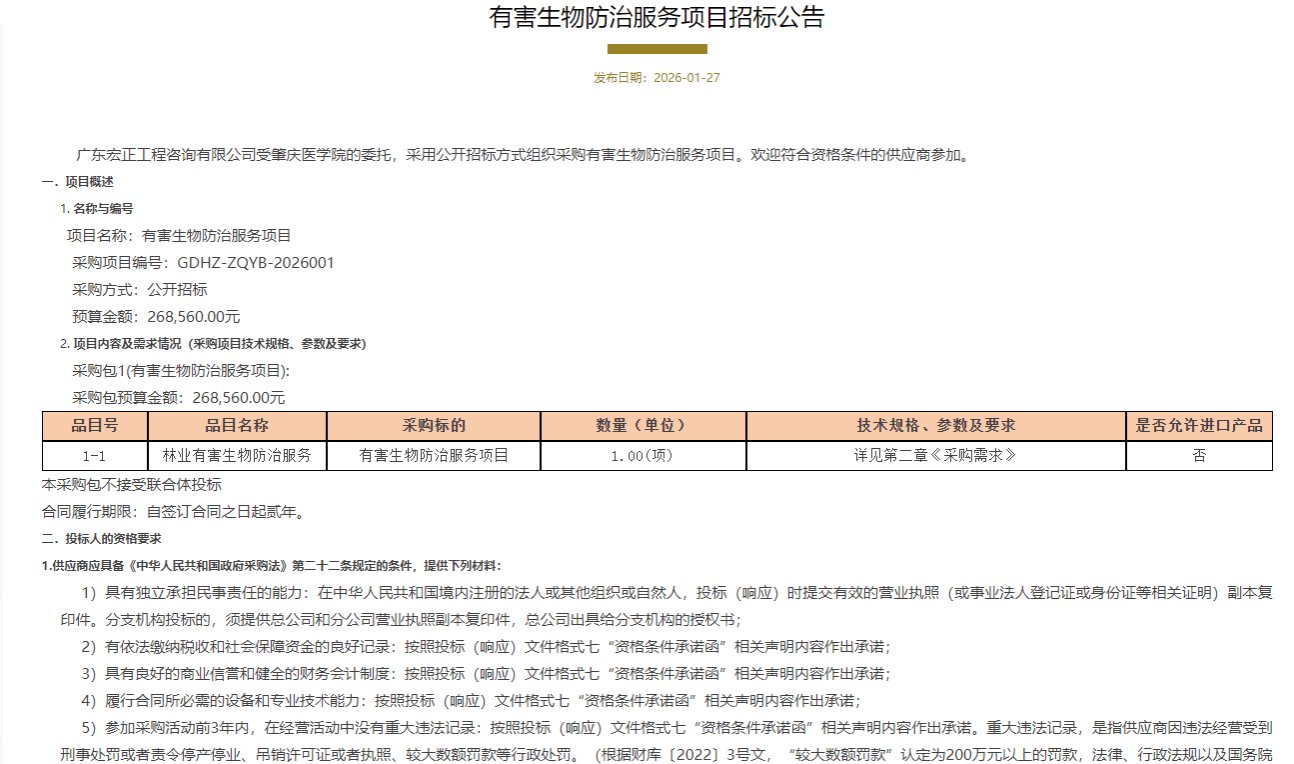 有害生物防治服务项目招标公告