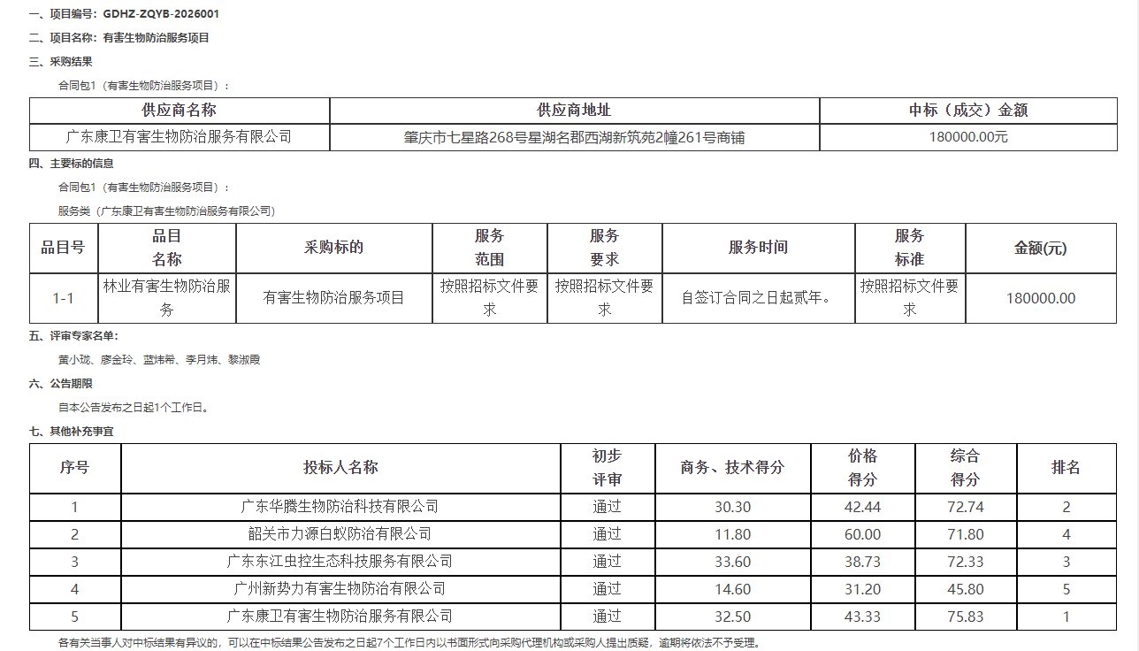 有害生物防治服务项目结果公告
