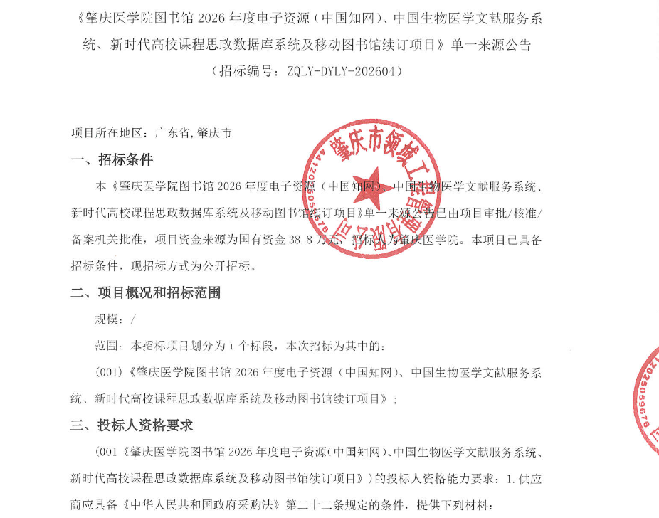 《肇庆医学院图书馆2026年度电子资源(中国知网)、中国生物医学文献服务系统、新时代高校课程思政数据库系统及移动图书馆续订项目》单一来源公告: