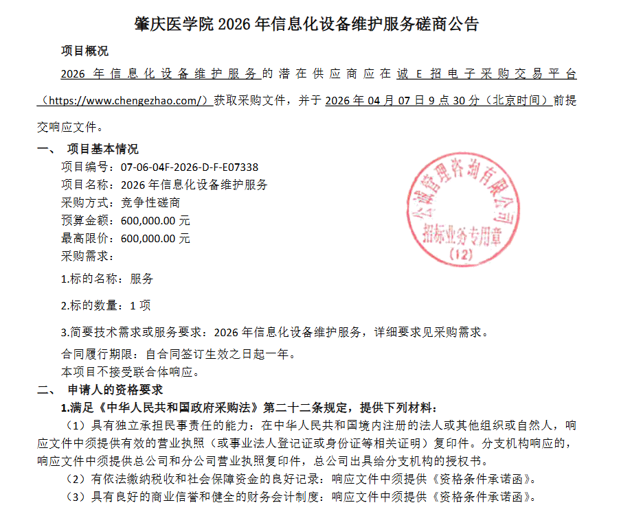 肇庆医学院2026年信息化设备维护服务磋商公告