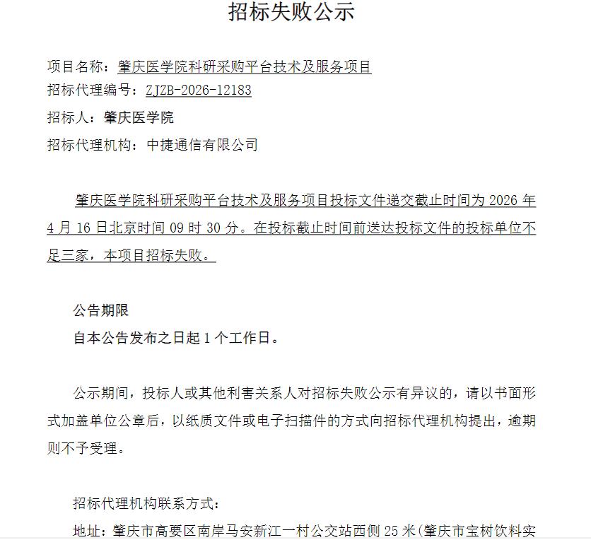 肇庆医学院科研采购平台技术及服务项目招标失败公示