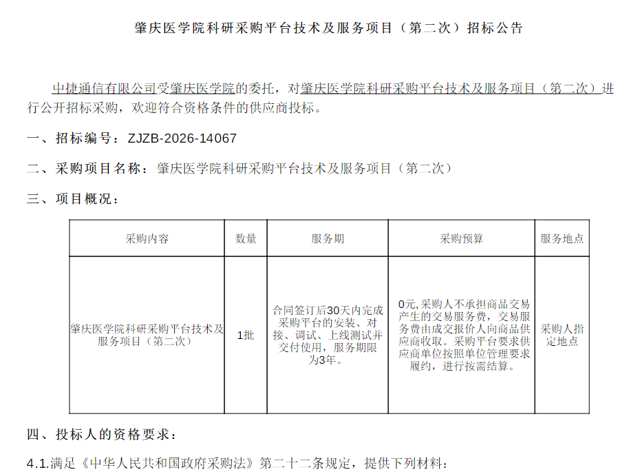 肇庆医学院科研采购平台技术及服务项目(第二次)[ZJZB-2026-14067]-招标公告